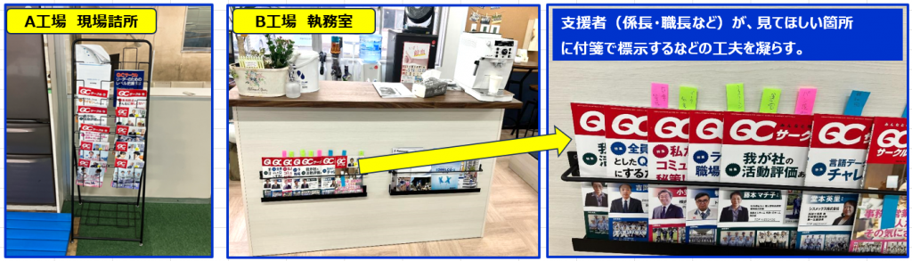 以前は『QC サークル』誌を,製鉄所内QC 世話人14 名のみに配付していましたが,所内現場の全係が閲覧するのに71 日間要していました。そこで,現場上長にあたる51 名へ配付することでタイムリーな情報発信を実現するために,増部しました。また,『QC サークル』誌をいつでも誰でも閲覧できるように,各現場にマガジンラックなどを設置しています。支援者がサークルに見てほしいページに付箋を貼りつけることで興味を引いたり,短い休憩時間でも要点を閲覧しやすくする工夫も行っています。